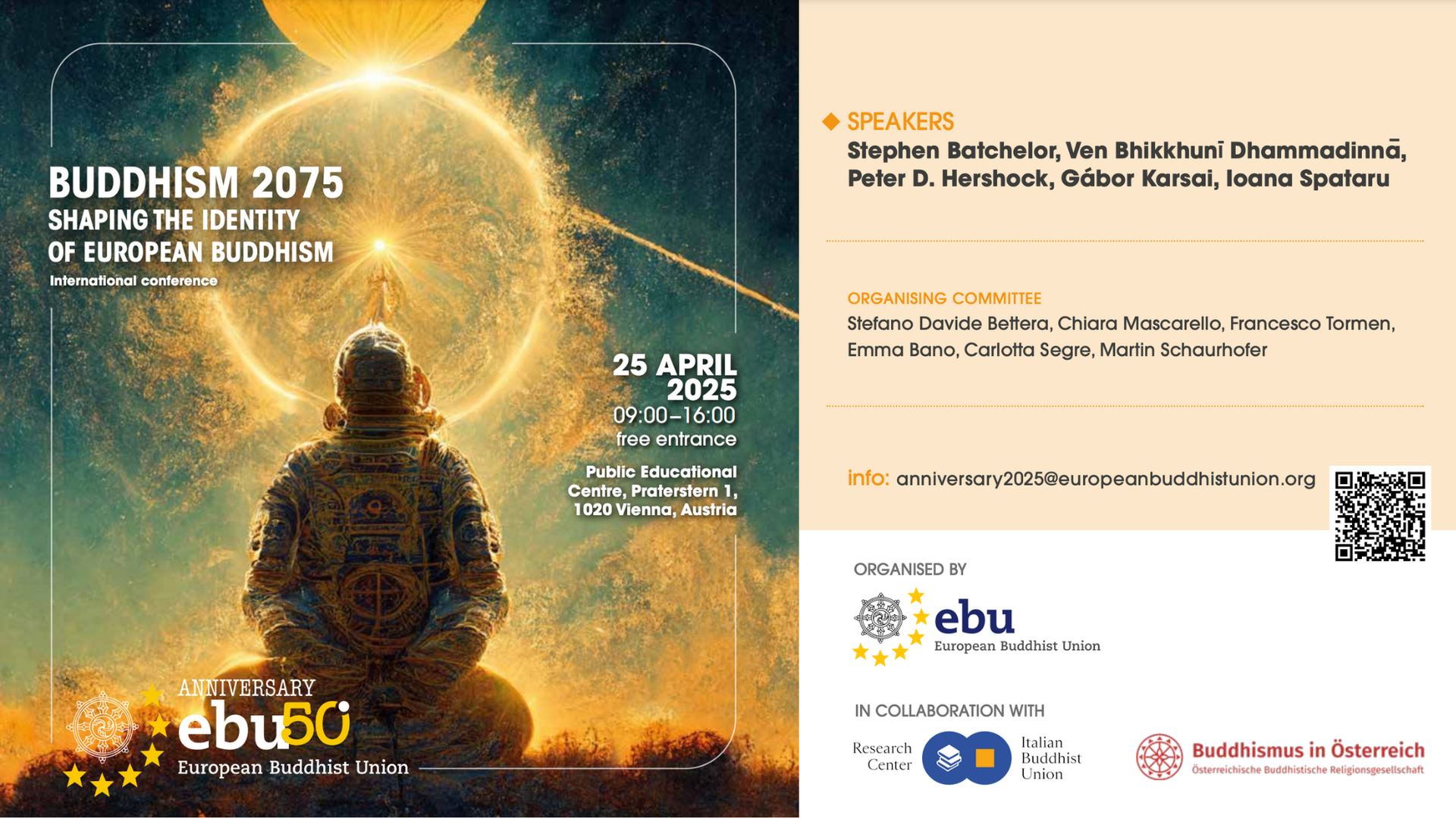 On the occasion of its fiftieth anniversary, the European Buddhist Union (EBU) invites the Buddhist community and interested audiences to reflect on the future of European Buddhism. The conference, guided by prominent voices in contemporary Buddhist thought, including representatives of younger generations, will explore how this tradition might evolve in an era of profound social, technological, and environmental changes.